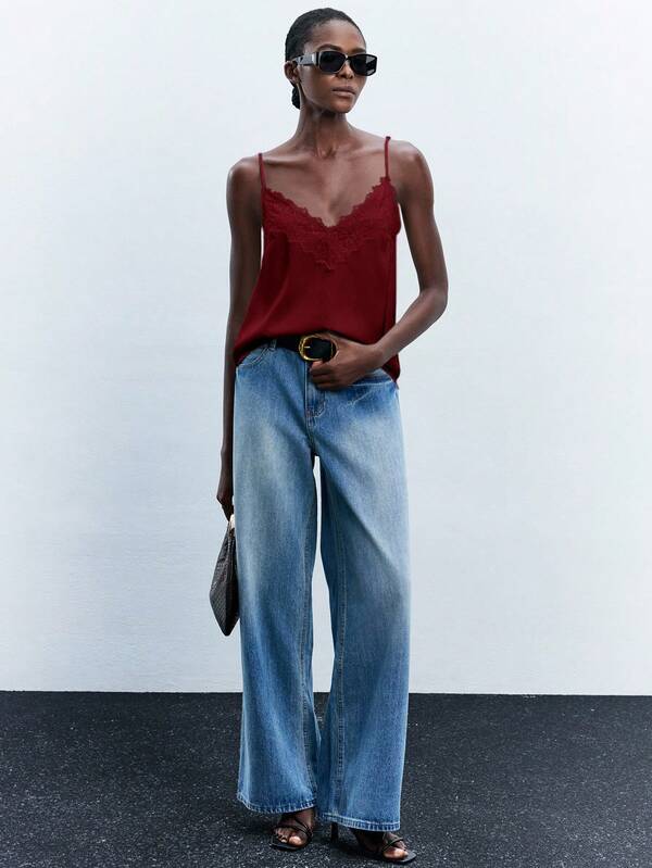 เสื้อสายเดี่ยวปรับสายได้ ลูกไม้คอวี สไตล์ตะวันตกโรแมนติก เหมาะหลายโอกาส